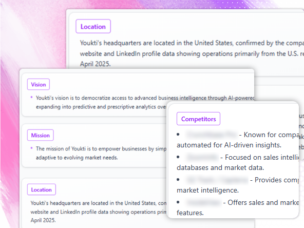 Get 100+ parameters researched across firmographics, products, financials, tech stack, hiring, competitors, and real-time signals—all within seconds.